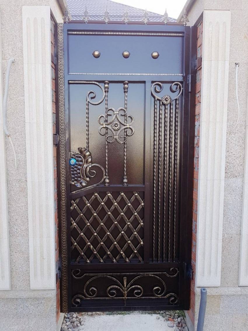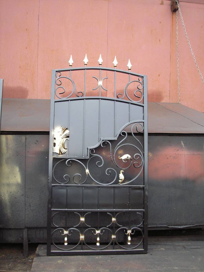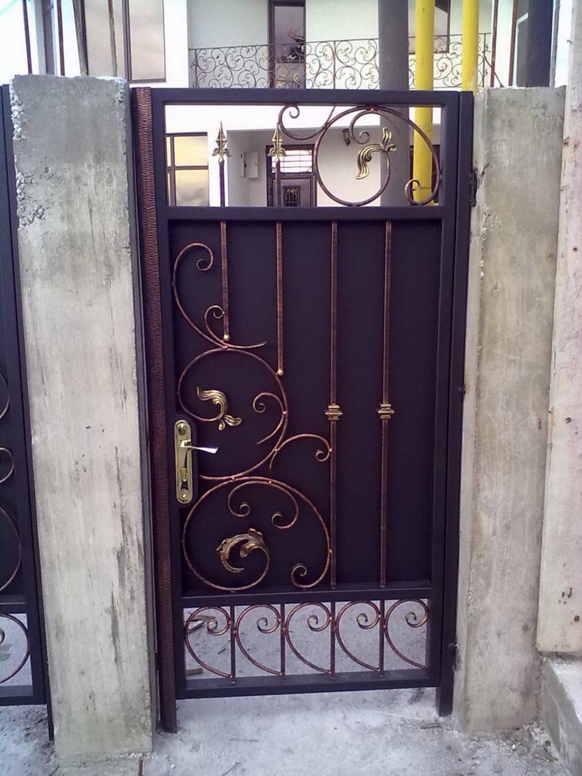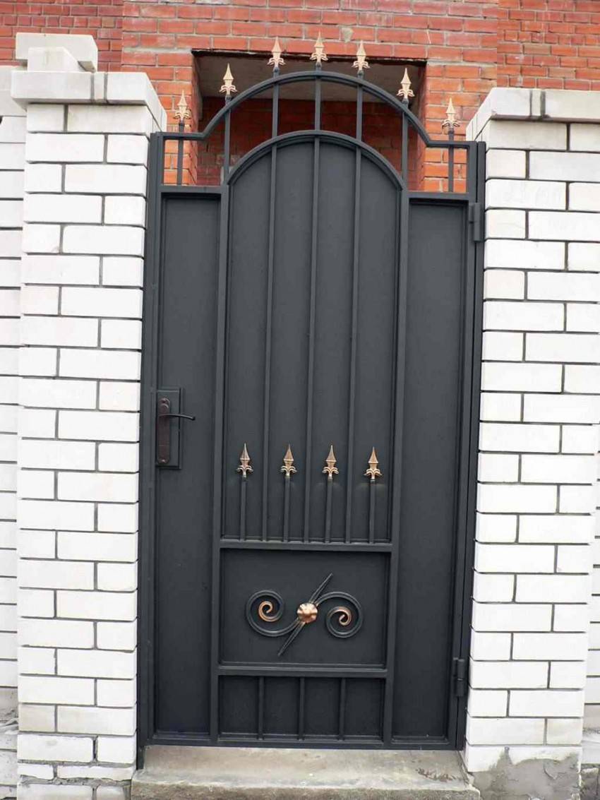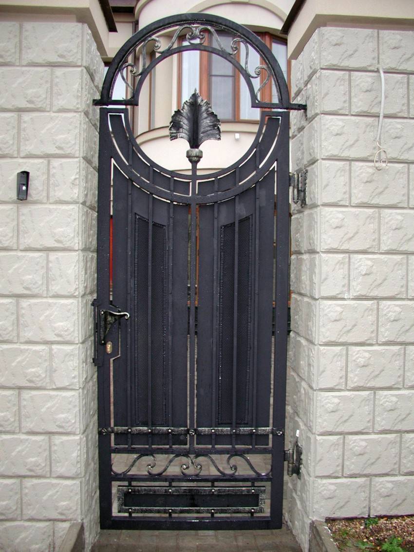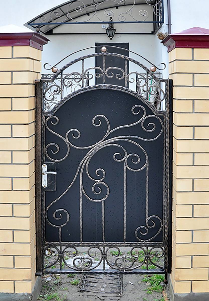 Входную конструкцию из металла вполне можно сделать своими руками. Если есть навыки ковки, то для украшения можно выковать оригинальные детали и приварить их на глухое полотно. Более изысканный вариант – ажурная калиточка на фоне глухого или такого же ажурного забора. Особый шик – ажурная входная дверь между глухими каменными стенами. Металлические калитки имеют ряд достоинств: