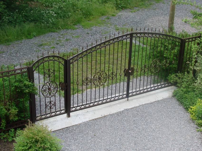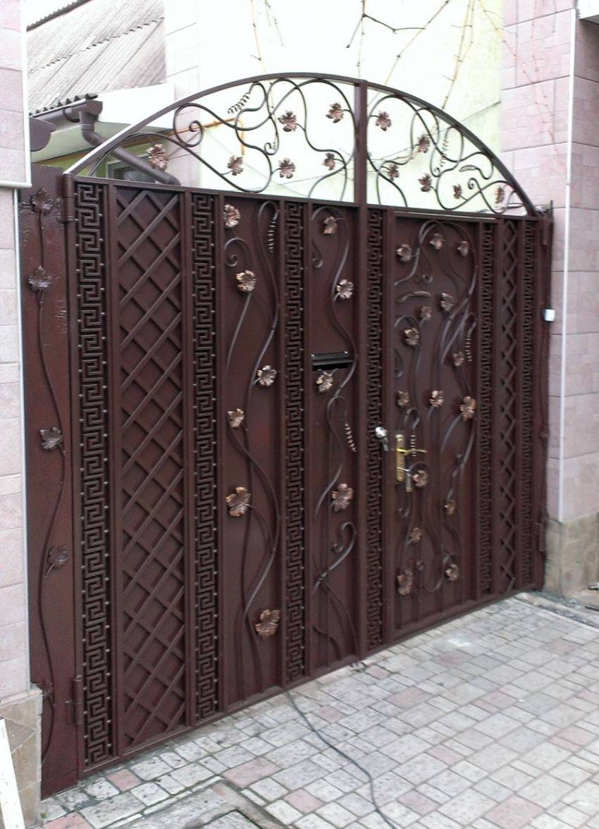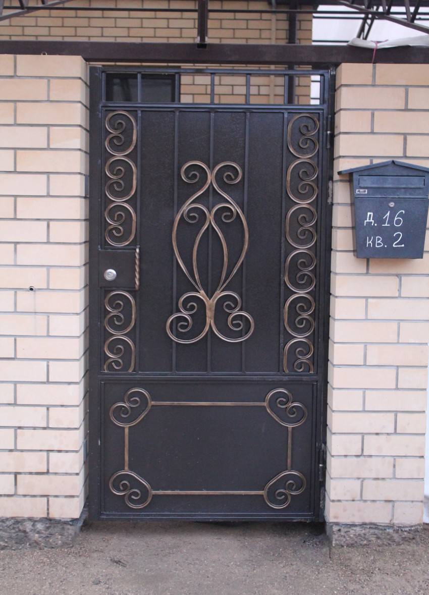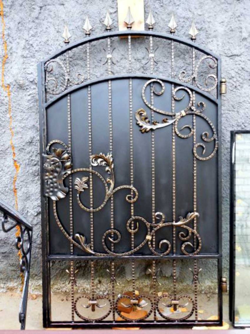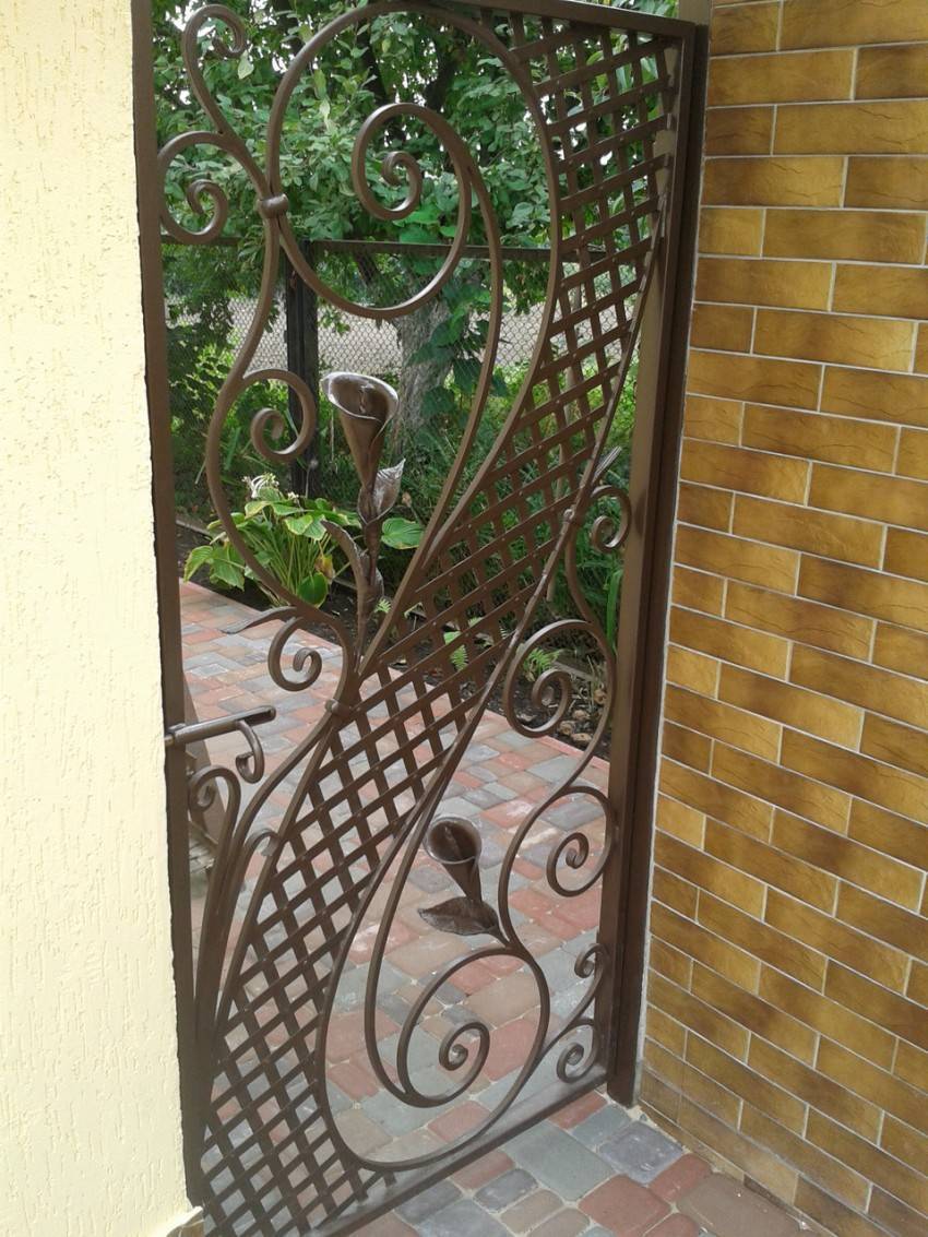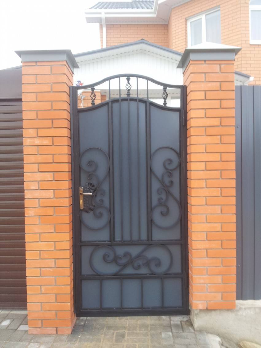 Входную конструкцию из металла вполне можно сделать своими руками. Если есть навыки ковки, то для украшения можно выковать оригинальные детали и приварить их на глухое полотно. Более изысканный вариант – ажурная калиточка на фоне глухого или такого же ажурного забора. Особый шик – ажурная входная дверь между глухими каменными стенами. Металлические калитки имеют ряд достоинств: