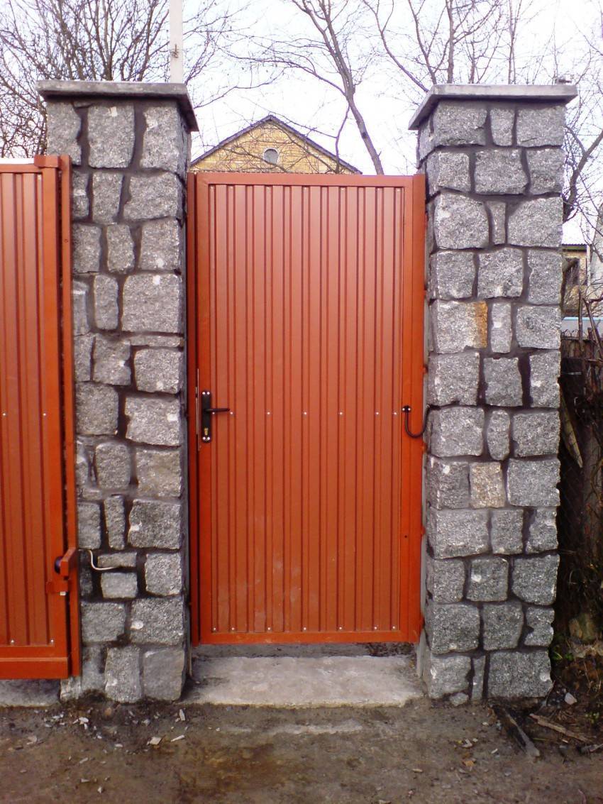 Как видите, схема, как устанавливается калитка из профнастила на каменные колонны или столбы практически идентична