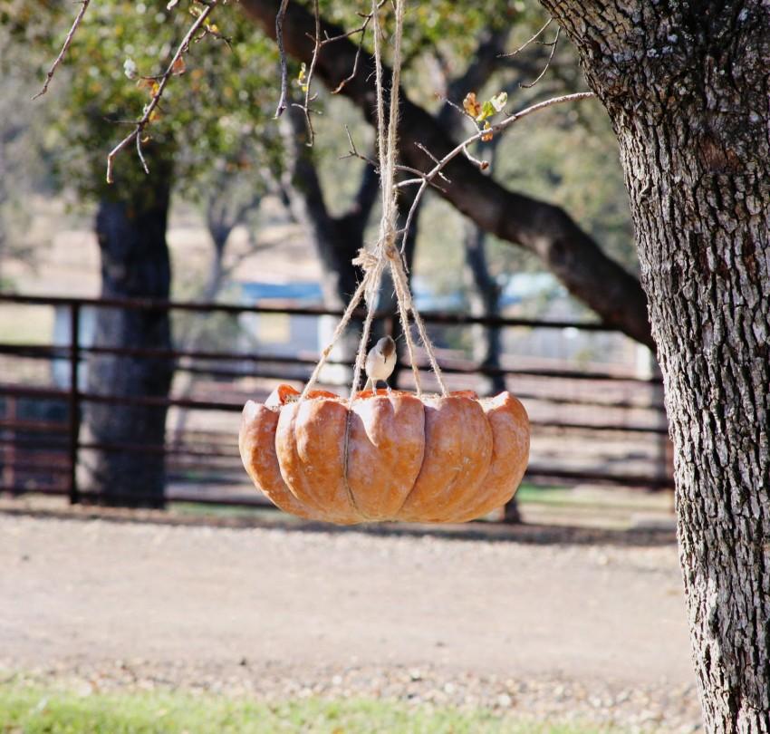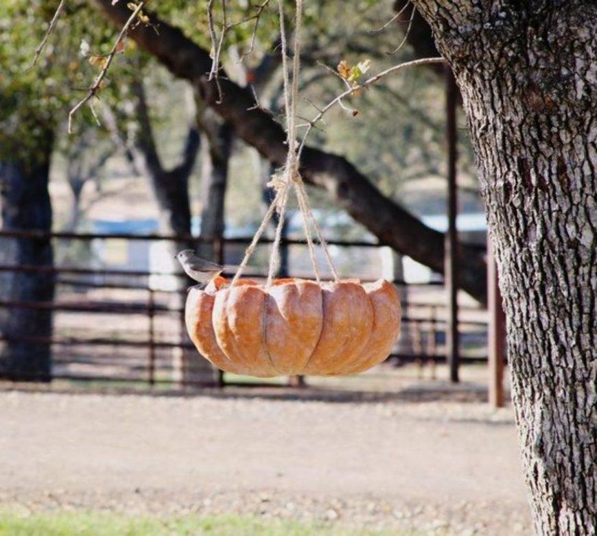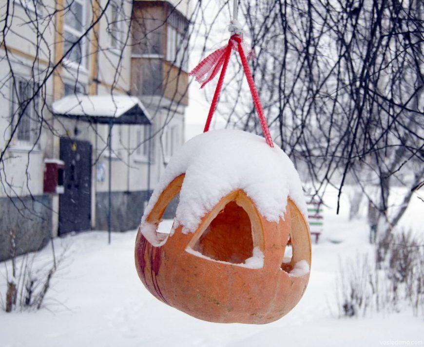 После опустошения тыквы сквозное отверстие надо увеличить, чтобы внутрь шара можно было закладывать пищу. Плодоножка тыквы послужит крюком для подвешивания натуральной кормушки. И хотя она служит всего 3-4 месяца, этого периода достаточно для оказания кормовой помощи пернатым. Также внутри тыквы небольшие птицы смогут прятаться от осадков.