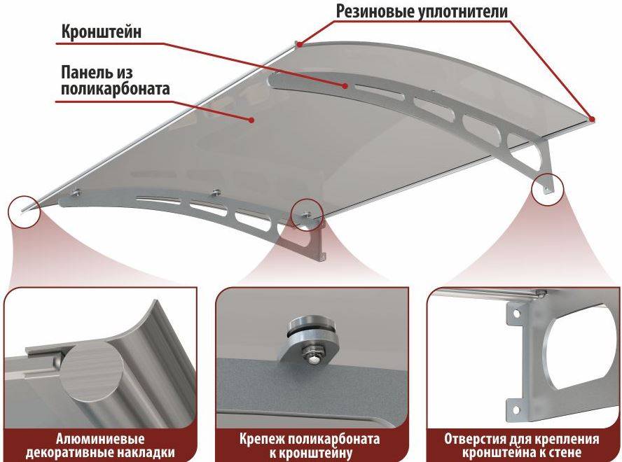 Отличием современных изделий является легкость конструкции, простота изготовления и установки к стене дома. Устройство козырька довольно банальное. Он состоит из таких частей:
