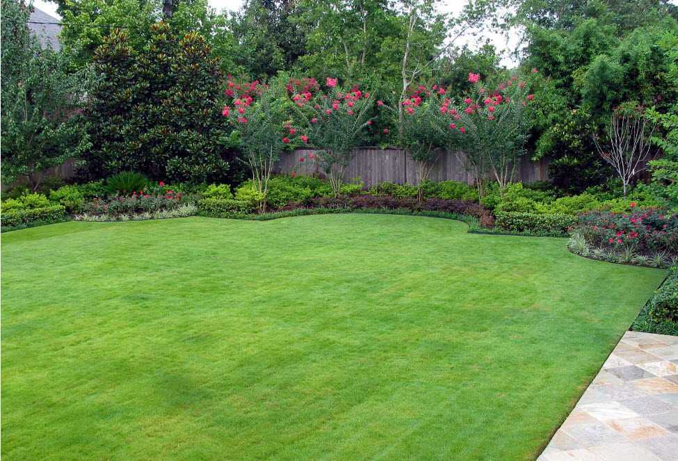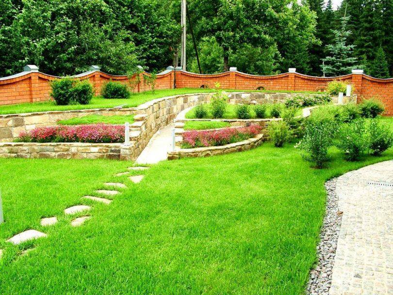 Главное, с чего нужно начать обустройство участка – выравнивание земли. Для этого скорее всего придётся вспахать грунт или привезти дополнительный. После выравнивания земли необходимо засеять ее газоном. Лучшие сорта газона: