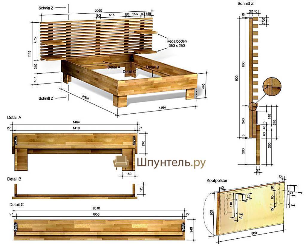 Поскольку вы будете делать двуспальную кровать из деревянных деталей, основные пункты списка покупок будут заняты пиломатериалами. Нужны: