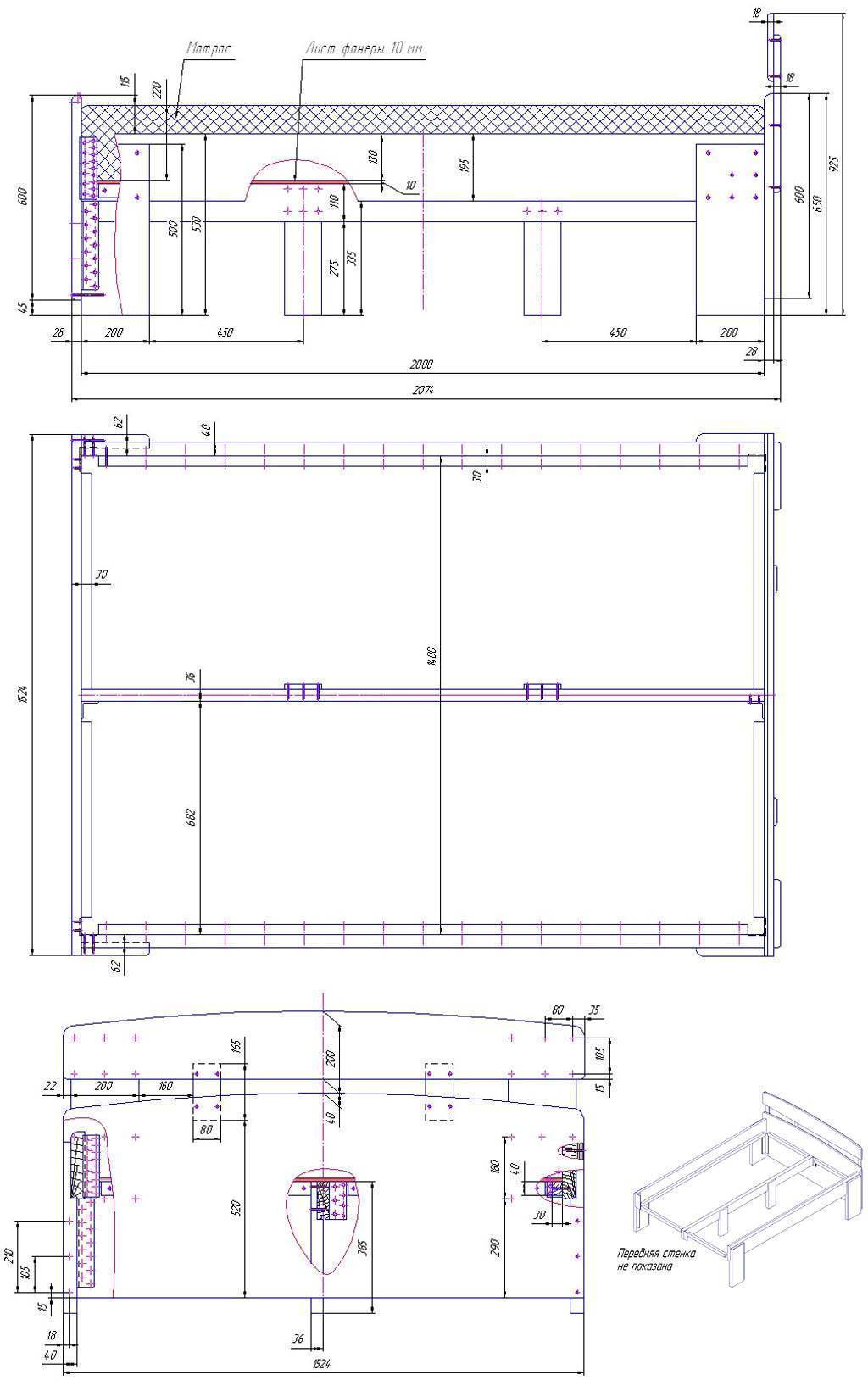 Кровати упрощенной конструкции, в которых спинки входят в силовую схему, а ножки выполнены заодно с ними, для взрослых делают только эконом-класса. И то, ножки отделяют от спинок и ставят сбоку вплотную к ним, чтобы образовался угол, придающий изделию хотя бы минимальную жесткость. Но все равно, где-то приходится ставить и дополнительные подпорки, опирающиеся прямо на пол, что не оптимально, см. далее. Чертежи кровати такого типа, рассчитанной на умеренно интенсивную эксплуатацию в течение 10-12 лет, приведены на рис. Передняя спинка/стенка отличается от задней только отсутствием декоративной надставки. Материал спинок ЛДСП, лежака – фанера; остальное – дерево. Сборка на саморезах по дереву и стальных уголках. А мы пойдем дальше, к кроватям, способным выдержать бабушку со множеством любовников и ее потомство.