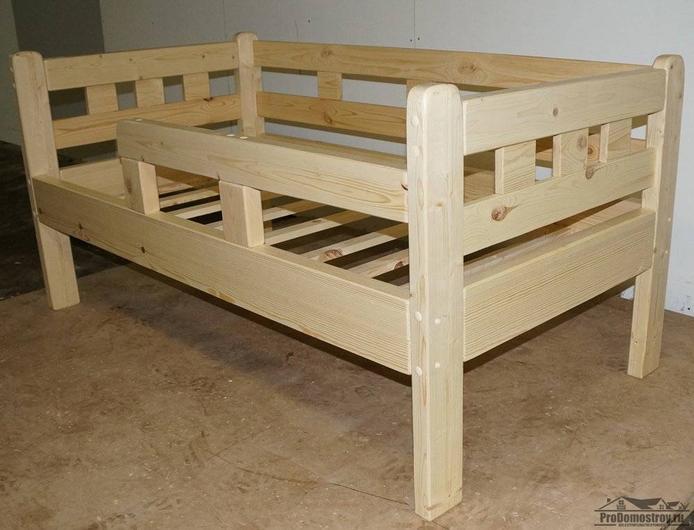 Стандартная односпальная кровать – длиной 1,9-2 м и шириной 0,9 м. На такой при случае люди обычной комплекции помещаются и вдвоем. Ширина при недостатке места может быть уменьшена до таковой вагонной полки – 550 мм. Но при этом обязательно должно быть боковое ограждение даже у кровати для взрослых.