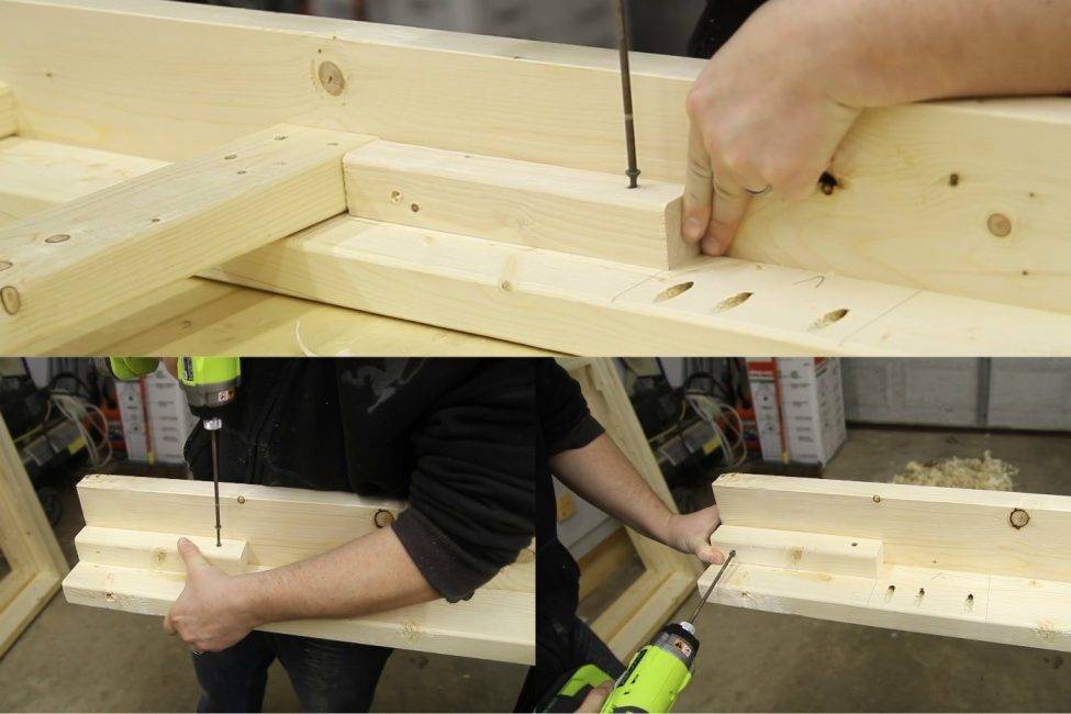 Чтобы они были скреплены между собой еще крепче, вырезаются четыре коротких бруска (их длина это ширина доски) и закрепляются на угол соединения с внутренней стороны каркаса. Соединять можно саморезами и клеем. Так будет надежней.