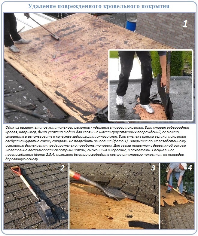 - Съем изношенного покрытия и гидроизоляционного ковра с применением захватки. Ее примитивной заменой может стать лопата со стальным штыком. Чтоб облегчить процесс удаления, рулонное покрытие можно загодя порубить топором.