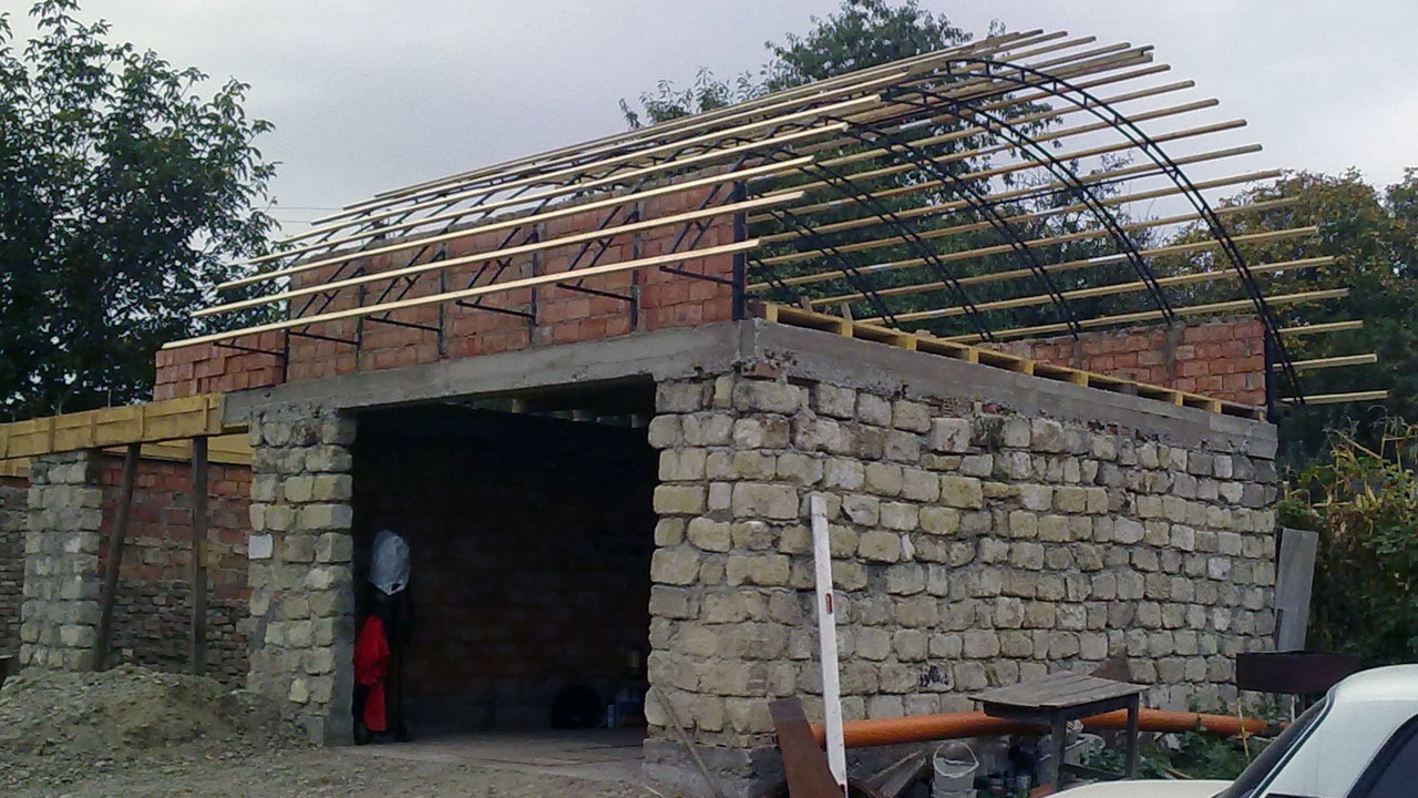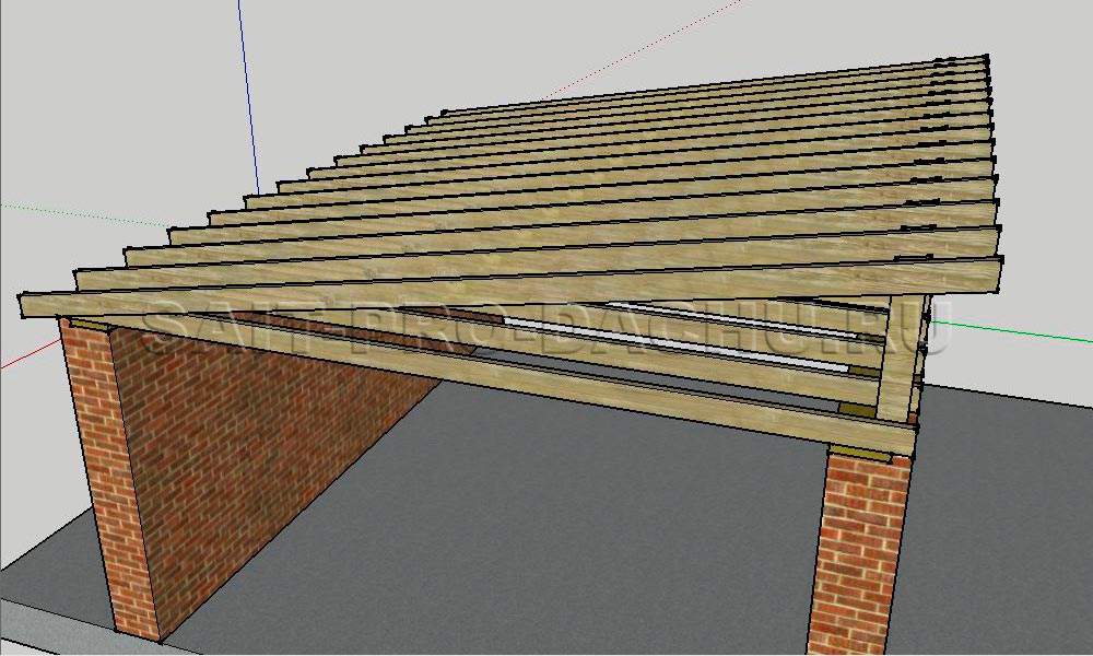 Затем на него монтируются стропила под определенным углом. Дерево должно быть высушено и обработано антисептическим составом. Конструкция должна выступать за края крыши гаража примерно на 20 см.