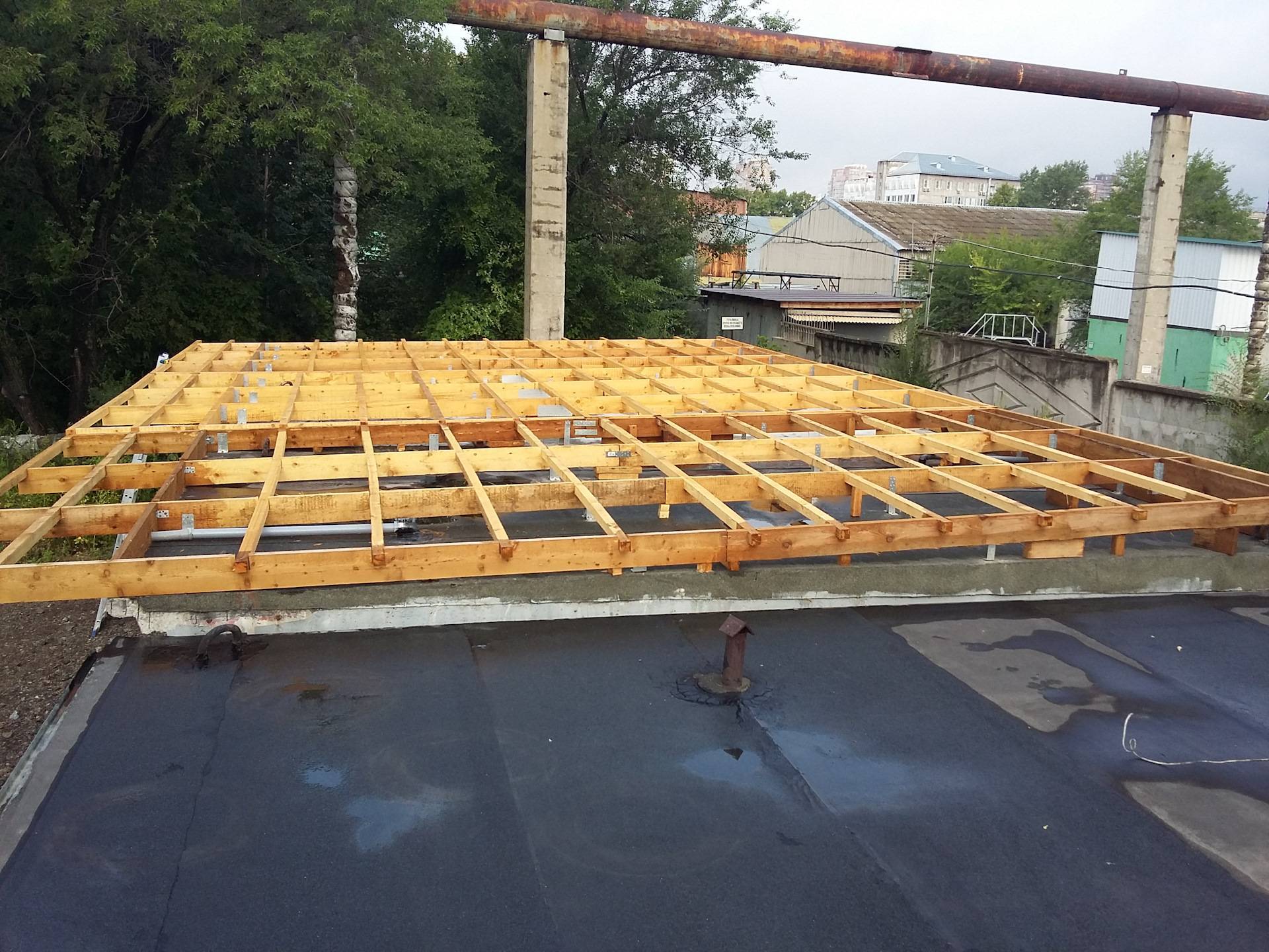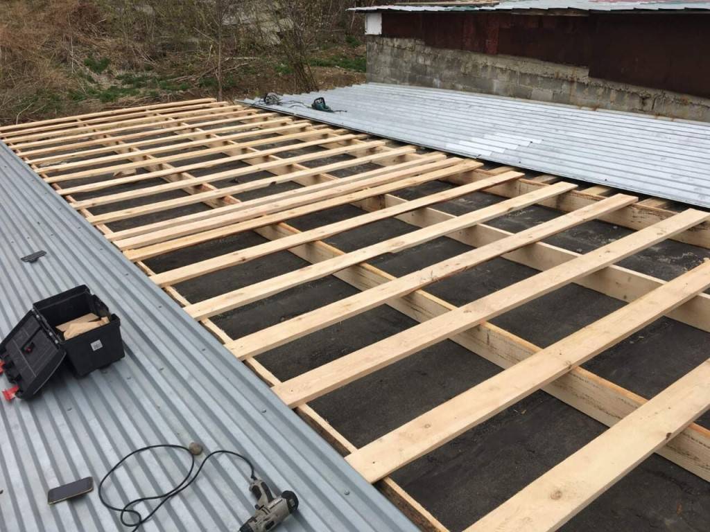Укладка брусков на крышу гаража для крепления кровельного материала
