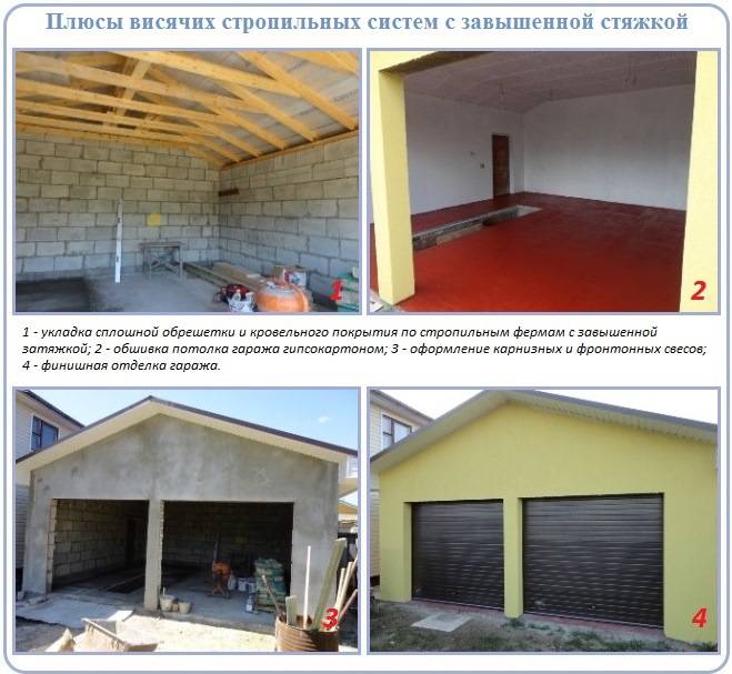 Висячая. Характерная особенность этого вида стропил, отличающая их от наслонных, заключается в том, что они имеют всего две точки опоры. Верхняя часть стропил опирается на коньковый прогон, а нижняя крепится к мауэрлату. Этот вариант используется для перекрытия гаражей на одно машинное место, где внутри нет несущих стен, которые можно использовать как дополнительную точку опоры. Висячие стропила не испытывают нагрузку на распирание, они работают только на прогиб, поэтому элементов в такой системе меньше. Для стабилизации каркаса монтируются затяжки, ригель, бабки и подкосы. С помощью висячих стропил можно своими руками перекрыть гараж шириной до 14 м.