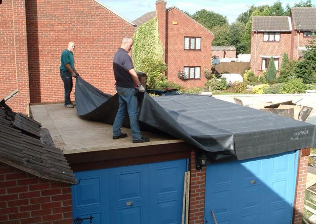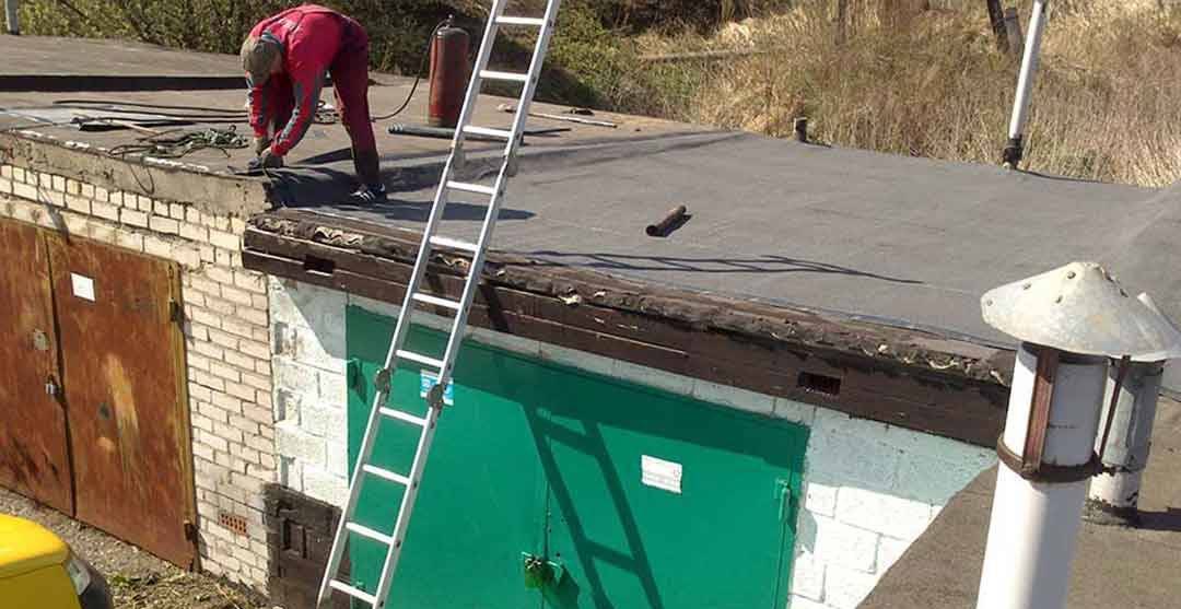 Когда поверхность крыши гаража подготовлена, укладывают новый гидроизоляционный пласт. Работу начинают с нижней стороны ската. Укладочные работы ведутся так, будто покрытие монтируется в первый раз.