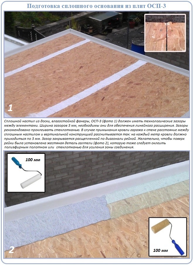 - Скрупулезный ремонт основания под укладку мягкой кровли гаража. Заделка стыков между ж/б плитами цементно-песчаным составом. Стыки между досками сплошного настила, панелями ОСП, плоского шифера или влагостойкой фанеры составами обрабатываются силиконовым герметиком и проклеиваются стеклосеткой.