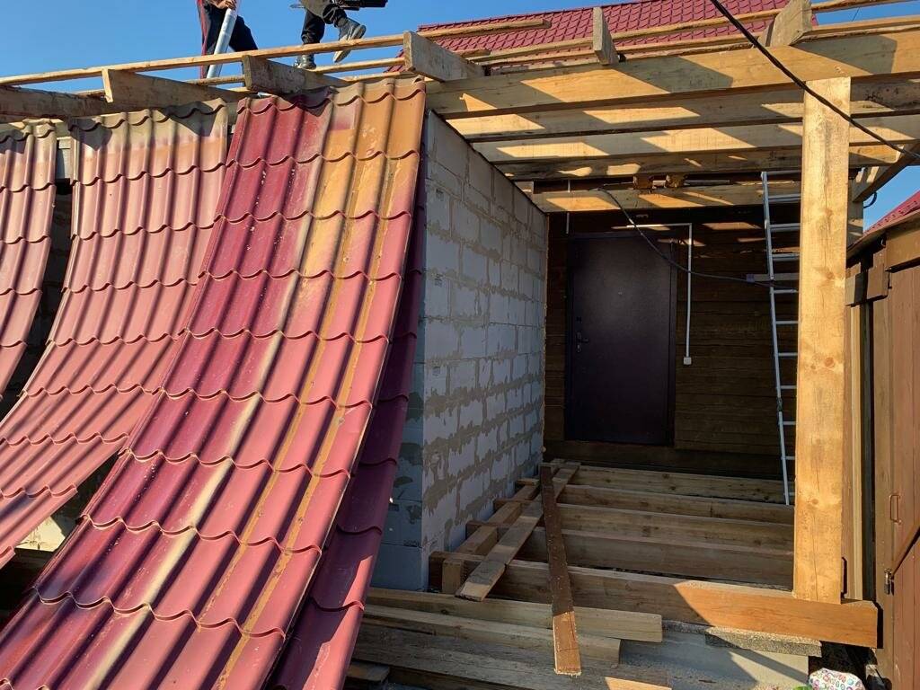 - Установка металлических элементов крыши, фартуков, планок крепления покрытия на вертикальных поверхностях, аэраторов, воронок, если имелись.