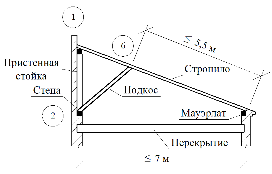 - Подкос. Подкосом называют дополнительный элемент стропильной системы, который служит для усиления конструкции в случаях, когда скат имеет длину, превышающую 4 м. Подкосы упирают одной стороной в мауэрлат, а другой в середину стропильной ноги.