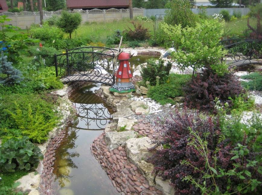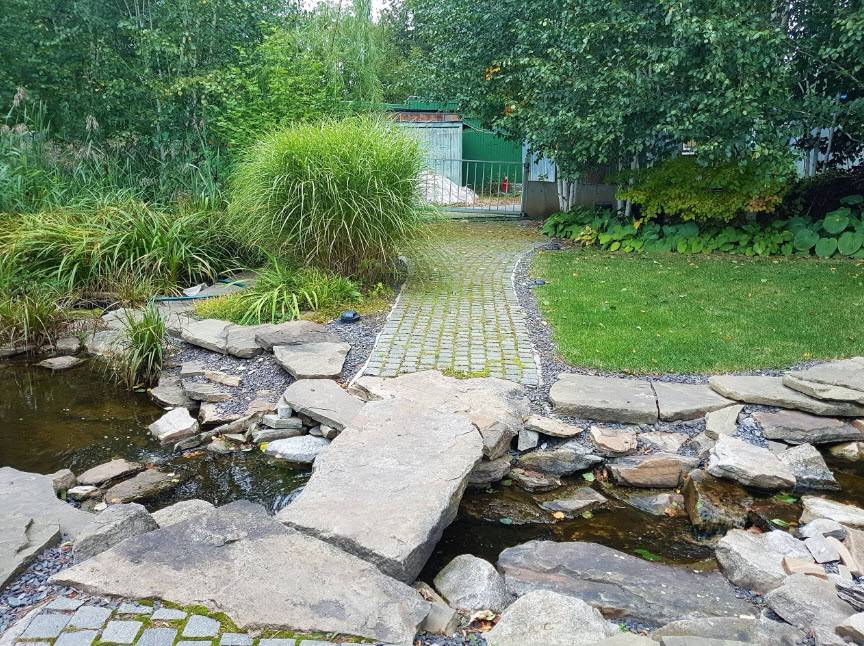 Ручей может быть как самостоятельным элементом водной структуры сада, так и дополнять, например, пруд. Тут вода должна быть обязательно проточной и не застаиваться. Именно поэтому для оборудования ручейка требуются насосы и трубы.