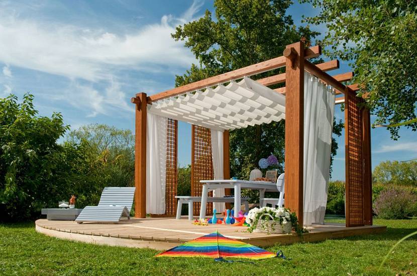 В последнее время стали очень популярными элегантные и стильные перголы. Они бывают разными по форме и дизайну. Несмотря на видимую простоту, такие террасы хорошо защищают от прямых солнечных лучей. Но при необходимости дощатые конструкции можно дополнить драпировками или растениями.