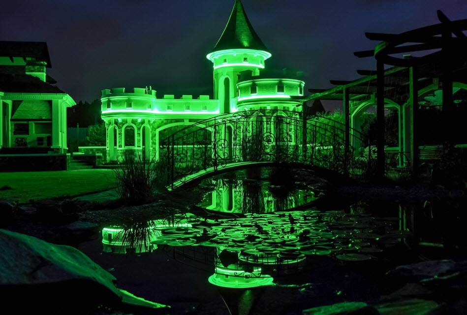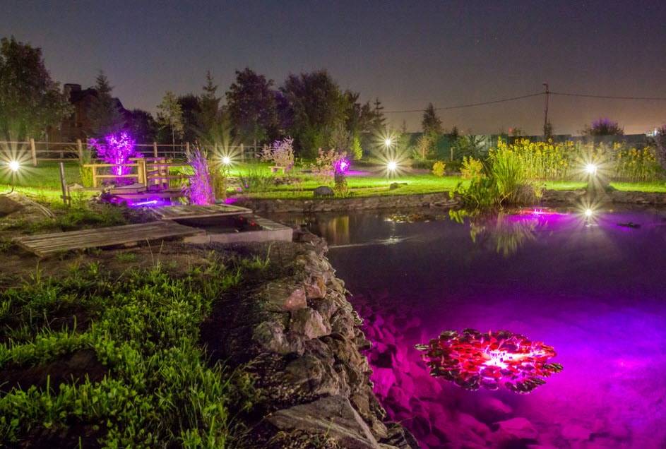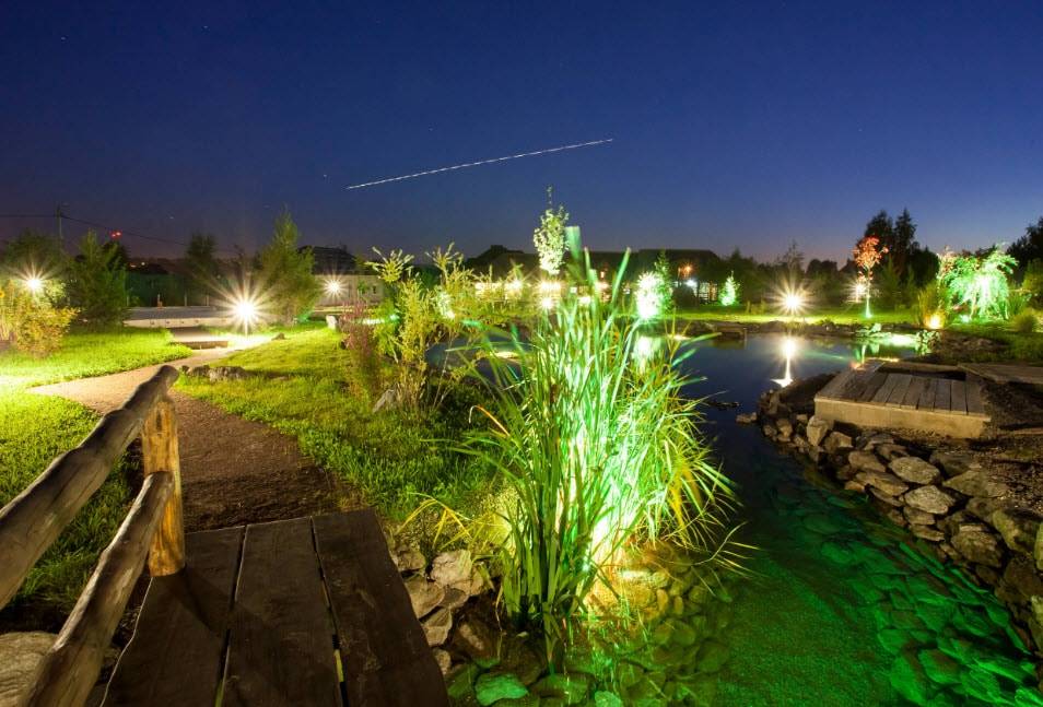 Еще один традиционный вид украшений — небольшие или большие водоемы — пруды и прудики. Совсем маленькие строятся быстро — из покрышки, так вообще за пару часов. На обустройство более объемных уйти может пару дней. Но водоемы устраивать раньше, чем построен дом и проложены дорожки, не стоит. Это украшение приберегите ближе к финишу. Также после основной стройки приходит пора ставить перголы, арки, навесы. И уже совсем под занавес, начинают играть с подсветкой, хотя есть очень простые и оригинальные идеи. Например, взять консервную банку, наделать в ней отверстий, но не просто так, а по схеме, создавая узор. Внутрь можно завести обычную маломощную лампу, а если электричества еще нет, поставить свечу и так поставить/повесить возле дома.