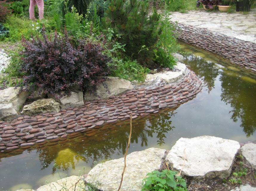 Для декоративного небольшого пруда достаточно выкопать яму любой формы и застелить ее двойным слоем пленки, обеспечив достаточно надежную гидроизоляцию. Берега укрепляют кирпичами, галькой или небольшими булыжниками.