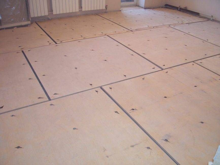 - Фанеру крепят шурупами или саморезами с промежутком в 15 см, оставляя небольшие зазоры возле стен и между листами. Зазоров в 0,5-1 см будет достаточно для избегания скрипов и вздутия из-за расширения материала.