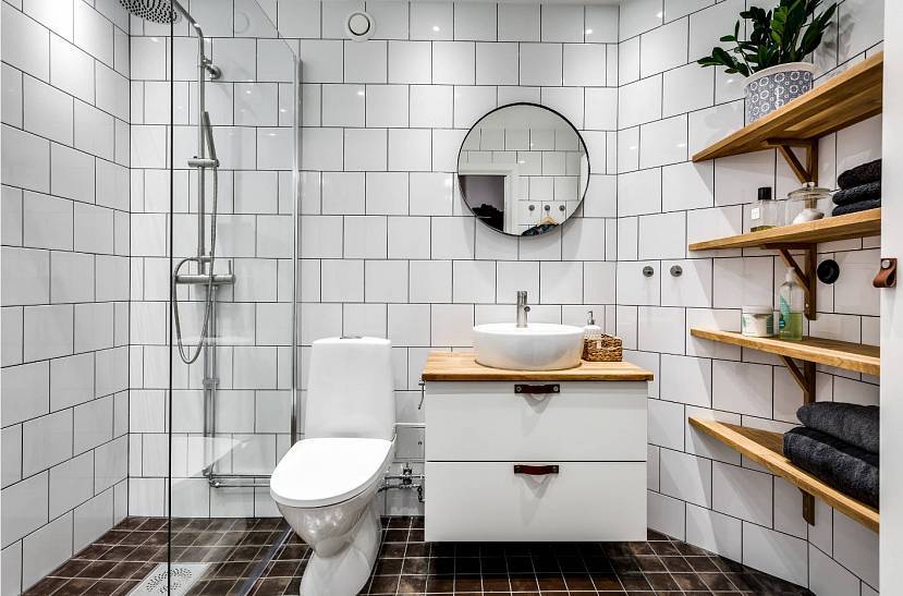 Важным фактором является выбор цветовой гаммы отделочных материалов. Для оформления маленькой ванной стоит выбирать светлые оттенки, они помогут сделать пространство более просторным. Темные цвета делают интерьер тяжелым, на них более заметны следы от капель воды. Преимущественно белый дизайн можно дополнить яркими акцентами, например, небольшими полками или цветным декором.