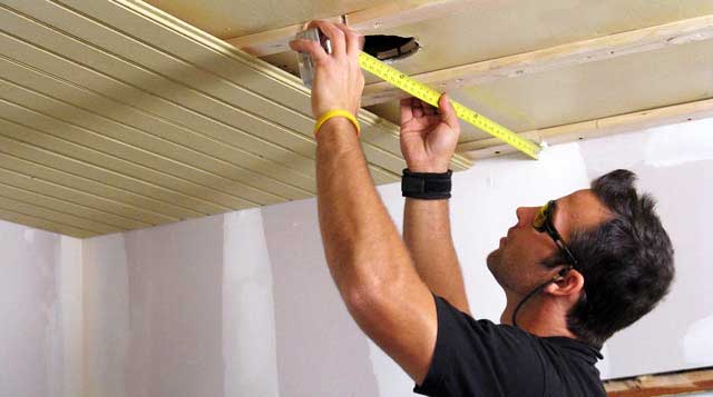Достаточно вырезать в материале круги около 20 см, вокруг планируемого светильника, это создаст хорошую противопожарную безопасность, что крайне важно для деревянного дома, и деревянных элементов декора. Важно эти места установить еще во время монтажа материала – меряем от стены места, затем ставим метку сверху, в виде круга диаметром 20 см