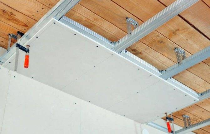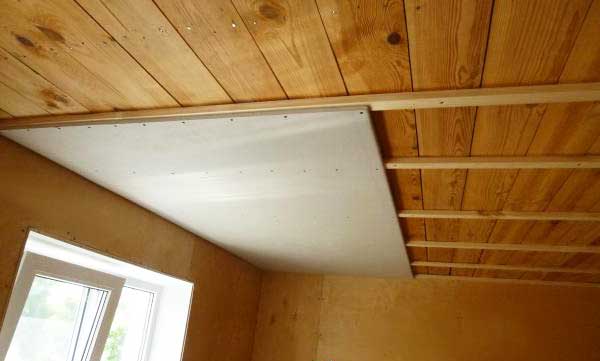 - Устройство каркаса потолка. В деревянных домах для этого делают обрешетку из брусков. В комнатах с возможными резкими перепадами температуры (ванная, кухня) и большим риском деформации деревянной основы лучше использовать металлические профили.