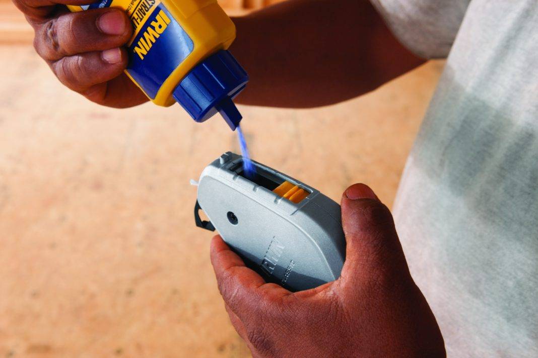 Его запас внутри корпуса придется восполнять всякий раз, когда линия разметки, отбитая шнуром, начинает тускнеть.