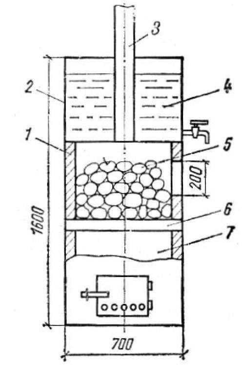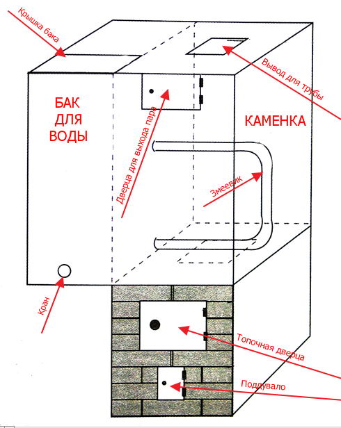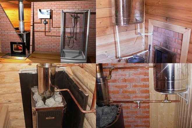 - водонагревательный бак, который может быть частью корпуса или располагаться над камерой с камнями.