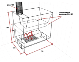После смешения с воздухом происходит их воспламенение, что приводит к повышению температуры в топке и прогреву камней до более высоких показателей. Если при этом используются сухие дрова в качестве топлива, то их потребуется значительно меньше. На таком принципе работы построено немало печей продолжительного горения, но для банных печей он стал применяться лишь недавно. Существует и схожая модель без дожига. Изучив ее чертеж можно лучше понять пропорции и размещение разных элементов.