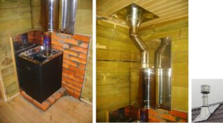 Дымоход для банной печи из металла также обычно металлический. Его можно делать из труб, сварным. Но при начале топки, особенно в холодной бане, печка будет плохо дымить и разгораться. Разумнее всего делать дымоход из системы сэндвич-труб. Такие системы имеются в продаже. Если же купить их не удастся, вначале прогрейте дымоход, сжигая лучинки в печи в течение не менее получаса, и только затем начинайте топить печь как положено.