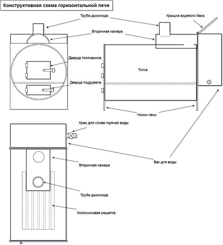 Конструкции печей из железа похожи и состоят из следующих основных элементов: