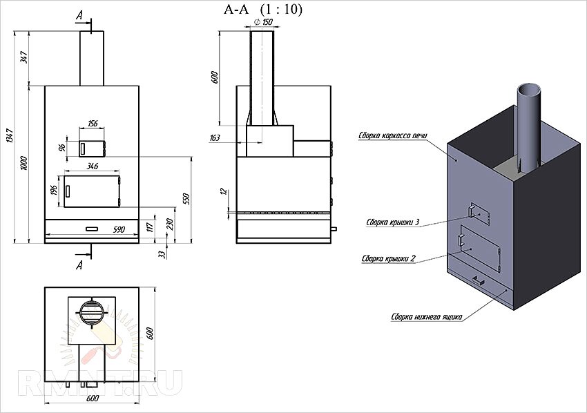 Чертёж банной печи из металла с точными размерами можно адаптировать под собственные нужды. Достаточно пропорционально уменьшить или увеличить размеры каждой детали.