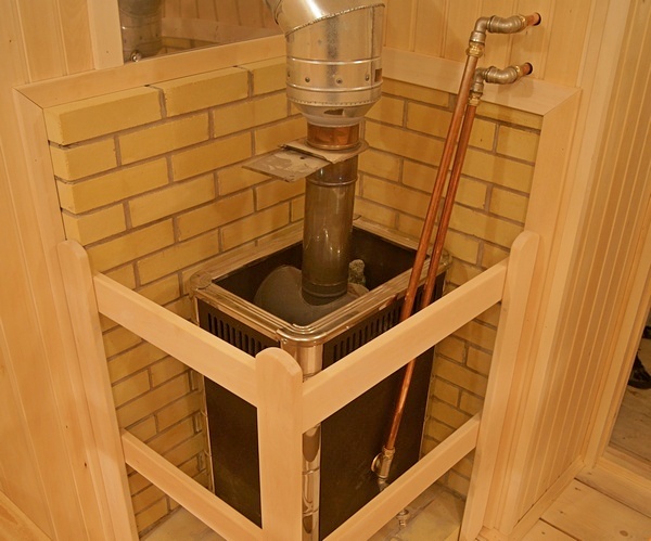 Металлическая банная печь, обложенная кирпичом для сохранения тепла