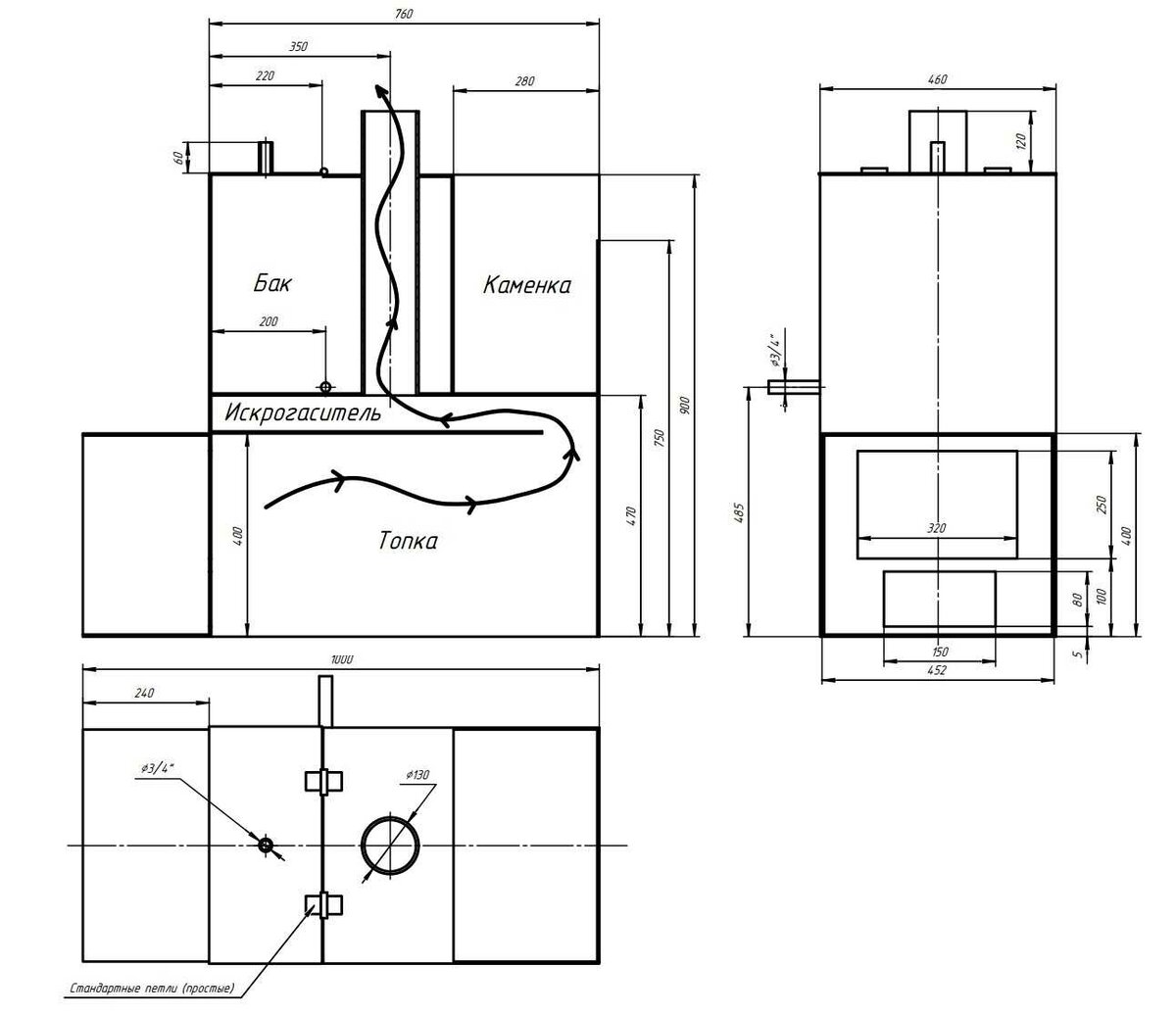 Не нужно специально придумывать, как сварить печь для бани, чертежи, можно найти здесь, они значительно облегчат задачу. Эти варианты многократно опробованы на практике, расчеты сделаны грамотно и точно. Достаточно найти подходящий вариант и точно следовать прилагаемой инструкции.