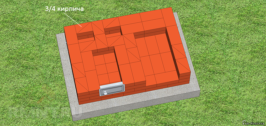 Начиная с 7-го рядка кладку ведут только на половине — правой или левой — как вам удобно, но данная раскладка дана под жарочную камеру слева — она шире, а слева находится столик. Если вам удобнее наоборот — делайте зеркальное отражение этой порядовки.