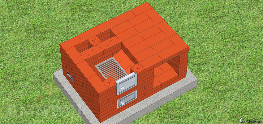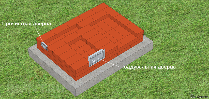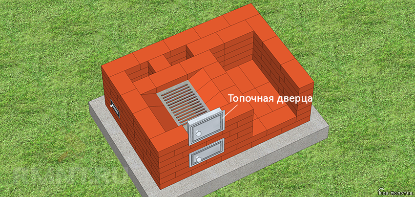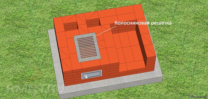 Центральная часть конструкции — топливник. Основание для жаровни заранее отливается из бетона с армированием или выкладывается из кирпича. Если по проекту сооружаются арки для топливника и ниш, применяется кружало. Для равномерного распределения кирпичей между ними вставляются щепки.