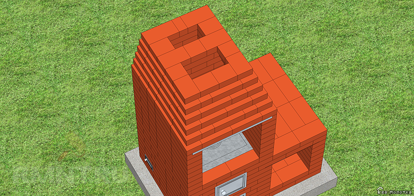 Последний этап — сооружение дымохода. Его наличие позволяет дольше сохранять жар в мангале и отводить дым. Для дымовой трубы кладку продолжают выкладывать, постепенно сужая ее кверху. Делается это путем смещения кирпичей в рядах. Смещение производится не более, чем на треть кирпича — в противном случае сооружение может оказаться неустойчивым.