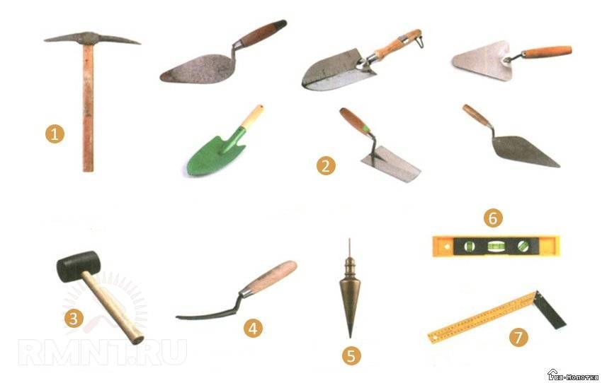 1 — кирка; 2 — кельмы; 3 — киянка; 4 — расшивка; 5 — отвес; 6 — уровень; 7 — угольник