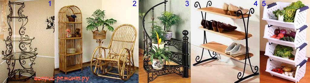 Сделать этажерку можно из любого более-менее прочного и поддающегося обработке материала, но начинающим мебельщикам увлекаться их разнообразием не стоит. Кованая (поз. 1 на рис.) или литая этажерка может быть произведением искусства, а функционально очень надежной и долговечной. Но для ее изготовления понадобится производственное помещение, спецоборудование, основательное умение и значительные затраты труда. Возможности изготовления без опыта в домашних условиях плетеных этажерок (поз. 2), помимо большой технологической сложности и трудоемкости, упираются в материал: этажерка не корзина, она должна долгие годы не терять устойчивости и способности нести нагрузку. Поэтому сильно и неравномерно усыхающая лоза не годится, нужен ротанг.