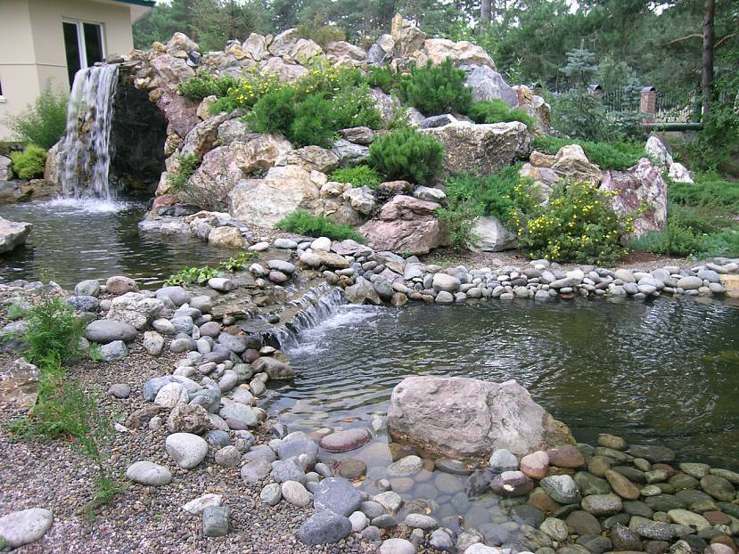 - На таком участке можно обустроить качественный пруд с плавным водопадом. Такой декор наиболее распространен для похожих территорий.
