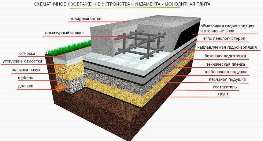 При строительстве фундамента в виде монолитной железобетонной плиты в обязательном порядке предусматривается устройство гидроизоляции и подушки из утрамбованного песка, который будет также компенсировать изменения объема грунта на вашем участке.