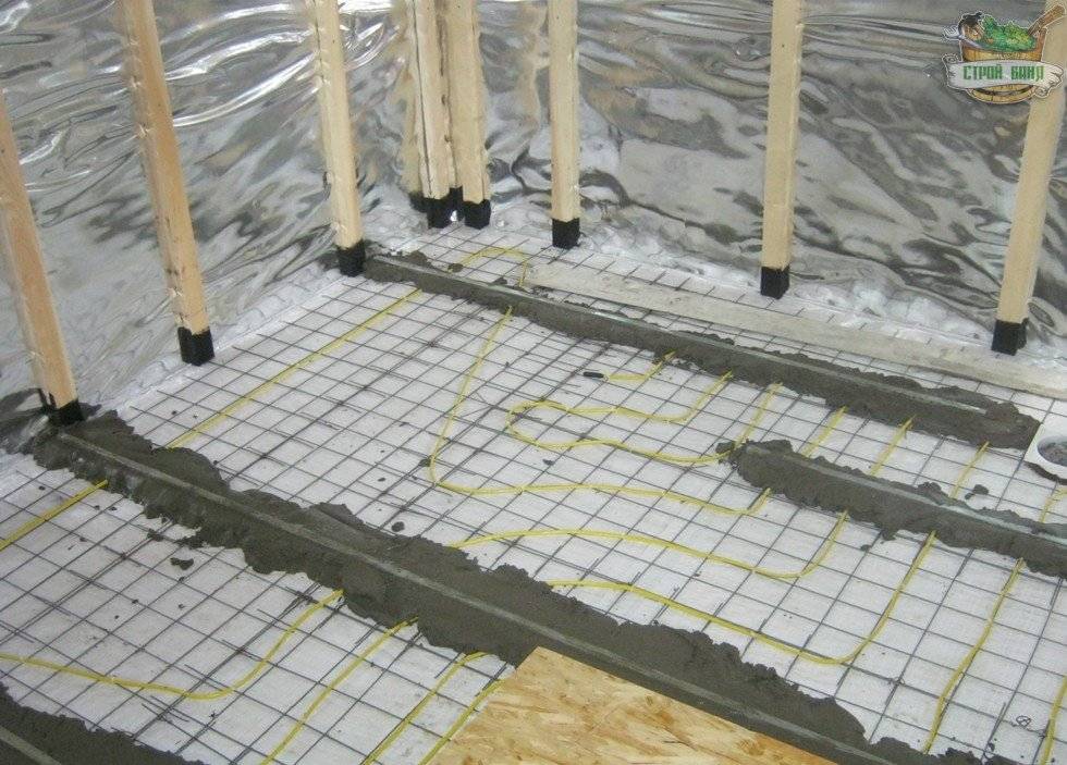 Как уже говорилось, бетонное основание холодное и неприятное на ощупь. Чтобы избавиться от этого недостатка, можно сделать теплые полы в бане в помывочной. Под финишный отделочный слой пола можно уложить электрические, водяные или инфракрасные полы.