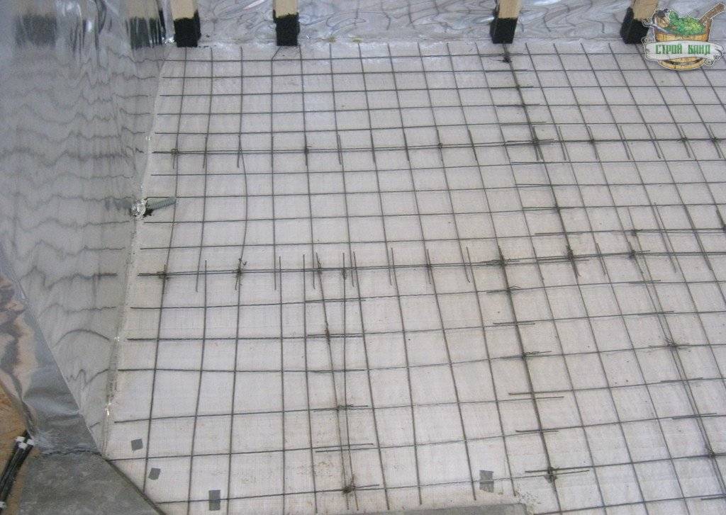 Для дополнительной прочности конструкции нужно поставить армирующую сетку. После уложить следующий слой бетонной стяжки.
