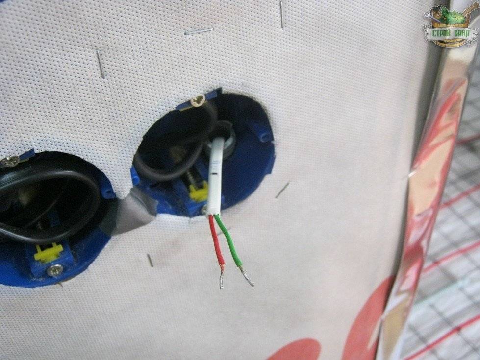Кабель прихватывался стяжками 100 мм. В стену установлен датчик теплого пола.