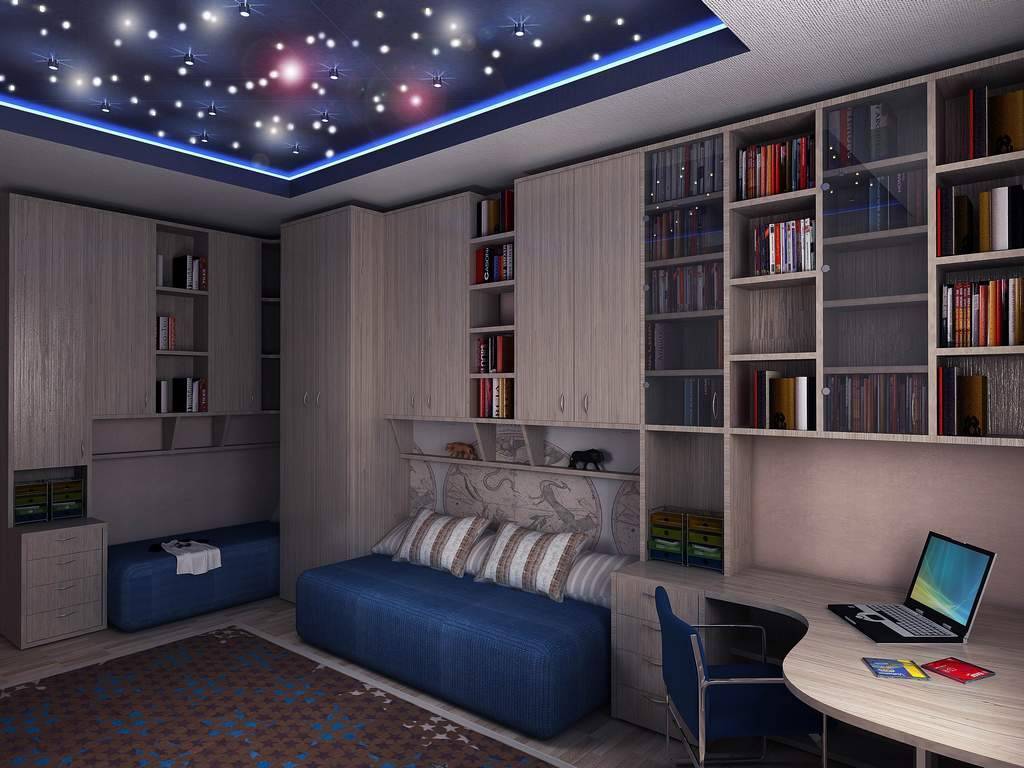 В детской комнате подсветкой можно создать настоящую сказку для ребенка, сделав потолок с изображением окна или звездного неба. Например, на первый уровень гипсокартонного потолка клеятся фотообои с изображением ночного неба и монтируется несколько точечных светильников голубого света, а по периметру второго уровня устанавливается скрытая подсветка.