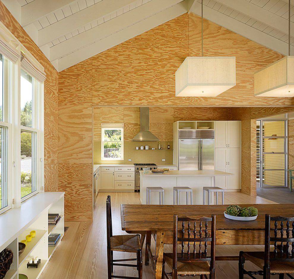 Хотя, в современных интерьерах, использование тонированной фанеры, может стать очень интересным решением – она отлично впишется в комбинированные потолочные решения и выглядит очень стильно.
