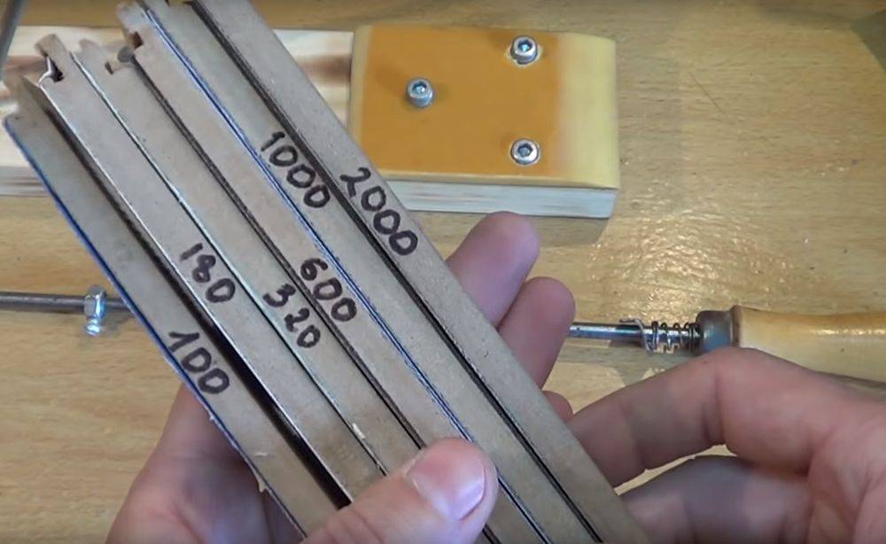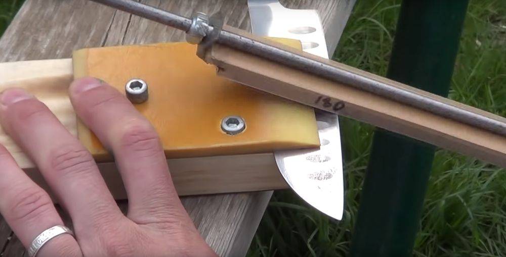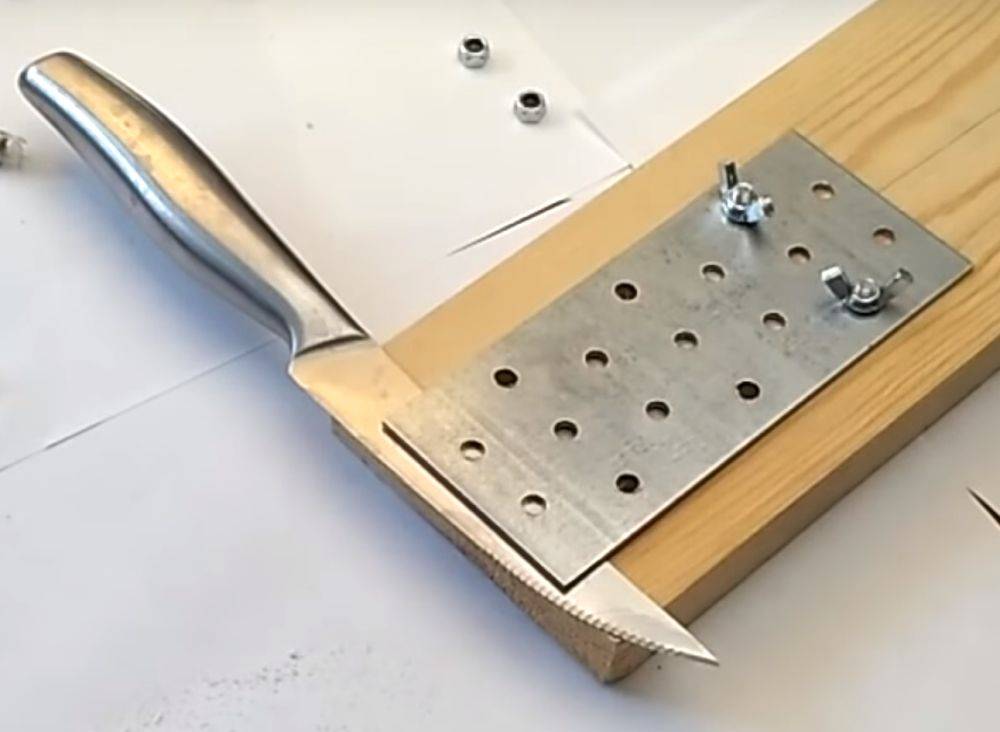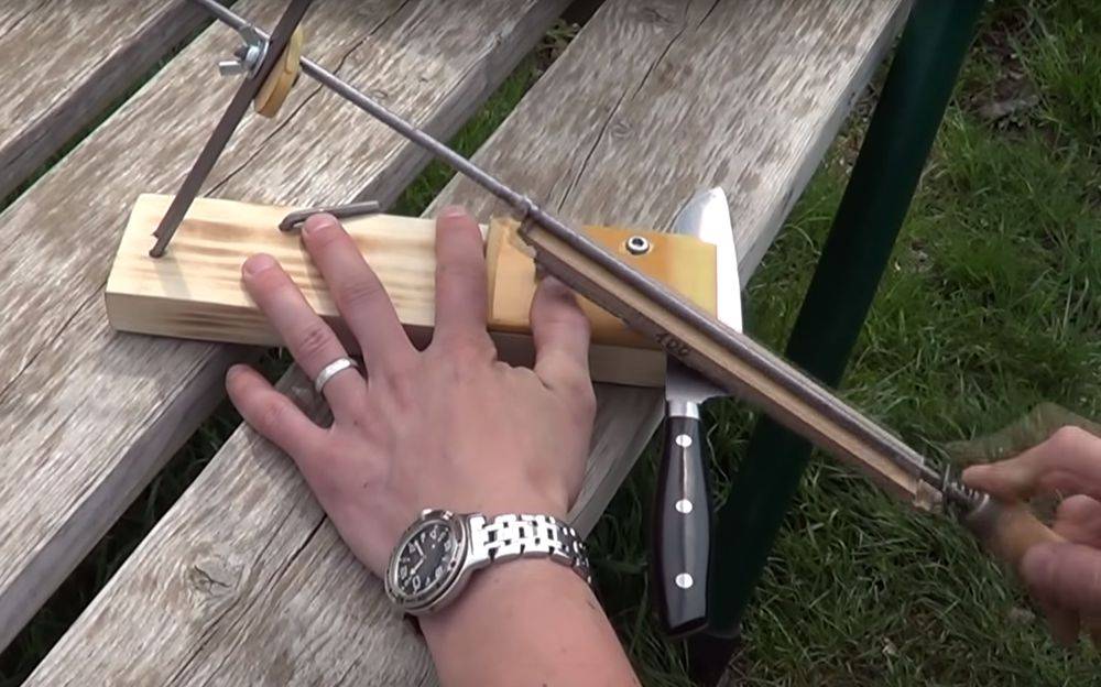 - Простое устройство для домашнего затачивания можно сделать из двух треугольников из дерева. Их ставят параллельно друг другу и соединяют винтами-барашками. Точильный брусок фиксируется между деревянными опорами под углом, который при желании можно поменять. Требуемый наклон абразива легко выставить с помощью транспортира или программы на планшете.