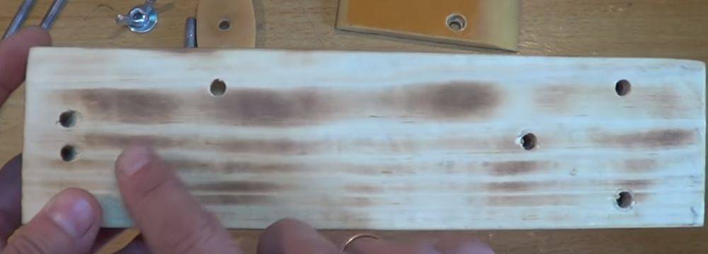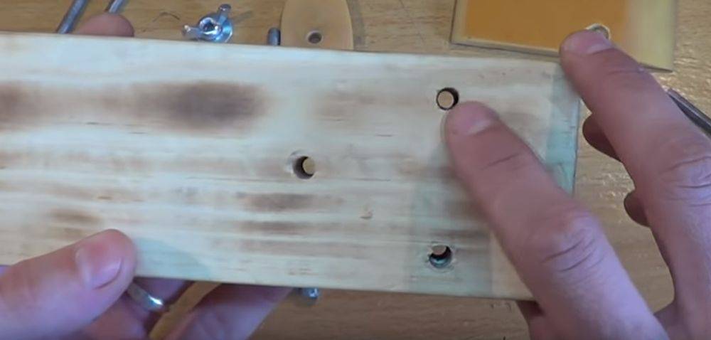 Далее в получившемся отверстии требуется нарезать резьбу под шпильку М8. Подготовленную таким образом деревянную плашку, необходимо прикрутить к основанию на расстоянии 265 мм от края при помощи обычных саморезов длиной 50 мм, вкрученных с обратной стороны основания.