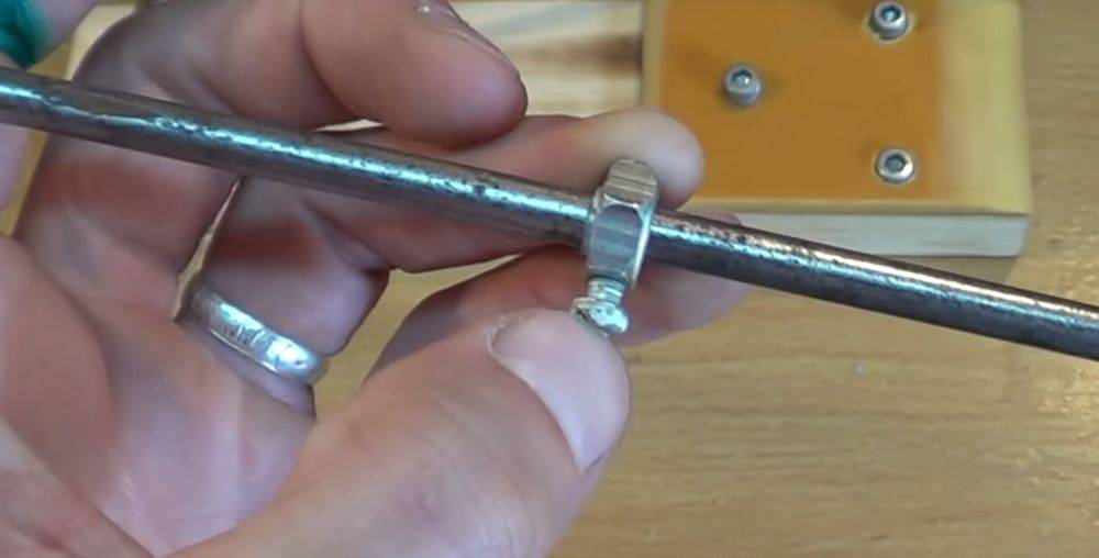 С другой стороны прутка, одеваем гайку м10 с нарезанной резьбой в ее грани и вкрученным винтом м5.