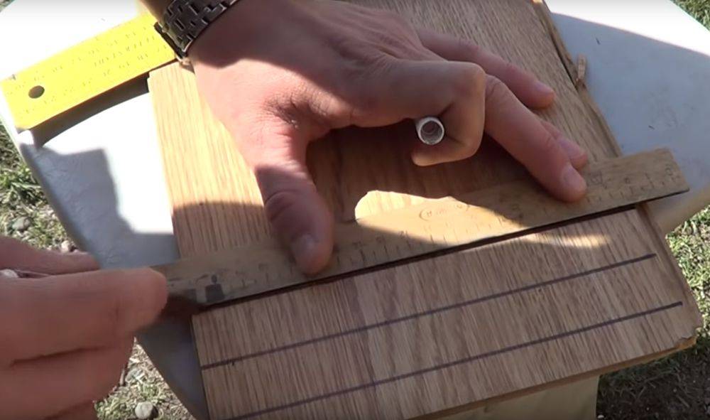 На внутренней или внешней стороне одной из дощечек наносится метка, соответствующая каждому из будущих углов заточки.